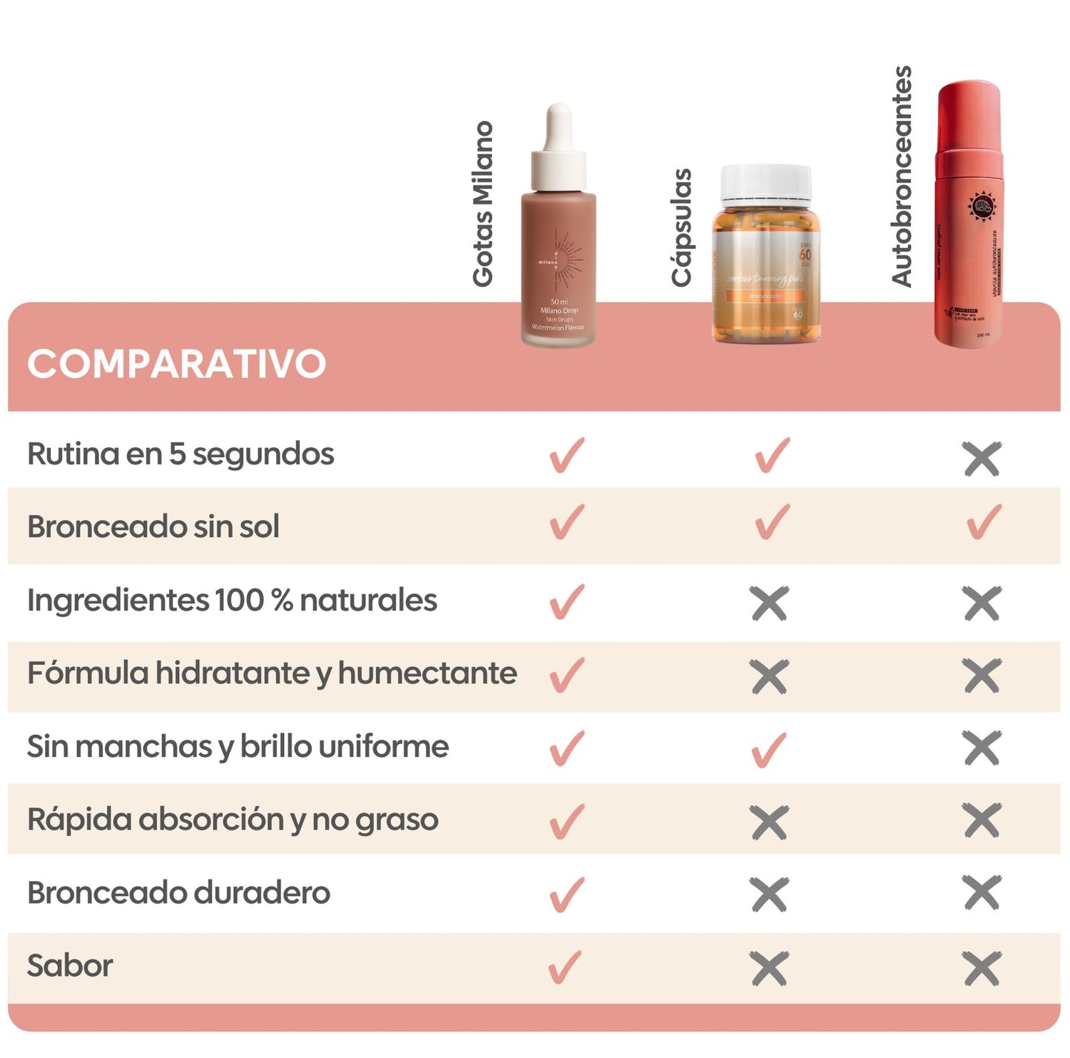 MilanoDrop estimula la producción natural de melanina desde adentro, brindándote un tono dorado auténtico, progresivo y sin riesgos por exposición solar. (Melanina + Betacaroteno y L‑Tirosina)